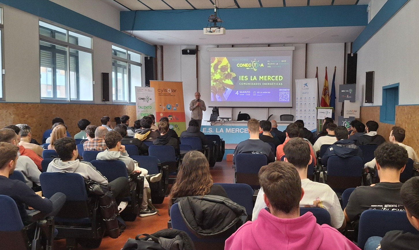 Valladolid, 4 de marzo de 2026. El Instituto de Educación Secundaria La Merced ha acogido el MiniForo CONECTA: “El talento que mueve la energía del futuro”, una jornada organizada por el Clúster de Energías Renovables y Soluciones Energéticas de Castilla y León (CYLSOLAR) junto con el centro educativo y con la colaboración de Fundación CaixaBank Dualiza, con el objetivo de acercar a los estudiantes las oportunidades profesionales que ofrece el sector de las energías renovables.